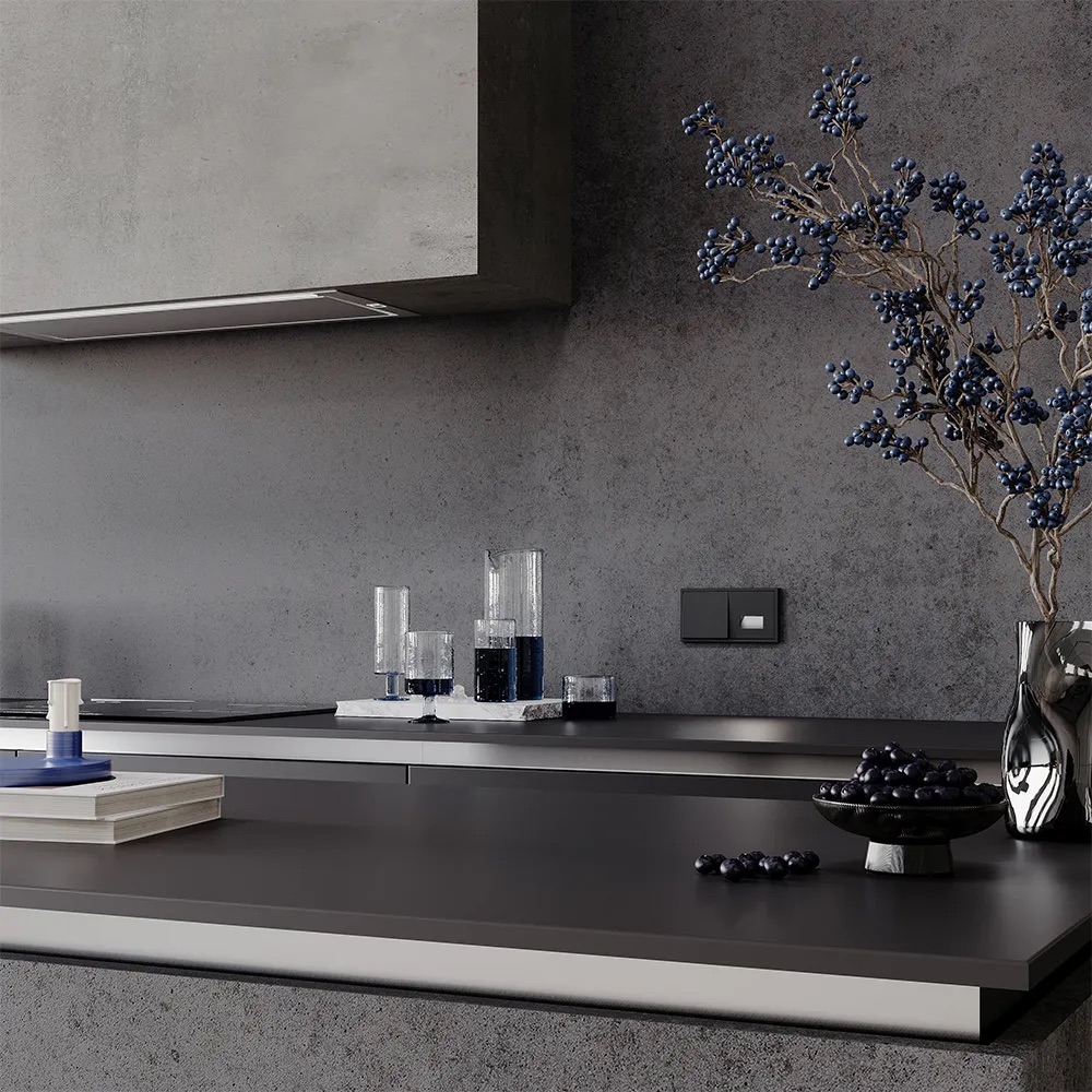 Выключатель полностью совместим с рамками из пластика и закалённого стекла той же серии и гармонично сочетается с другими устройствами VOLTUM S70 — от розеток до терморегуляторов и датчиков движения.